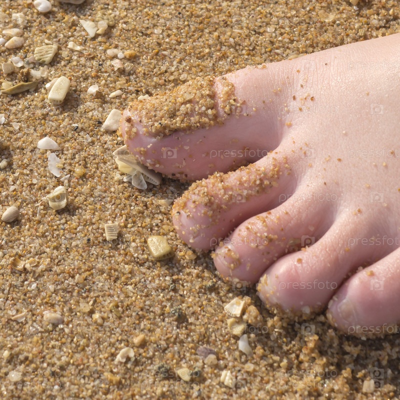 Ступня стоит на морском песке