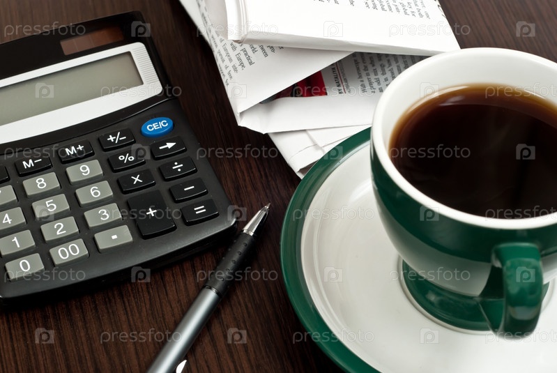 Чашка кофе, калькулятор и ручка с газетой на деревянном столе