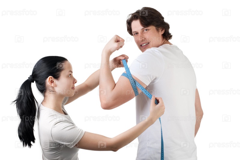 Девушка измеряет бицепсы у молодого мускулистого мужчины на белом фоне