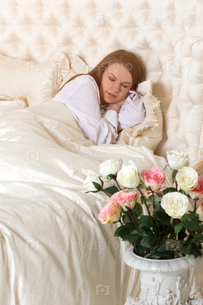 Спящая женщина в постели с розами