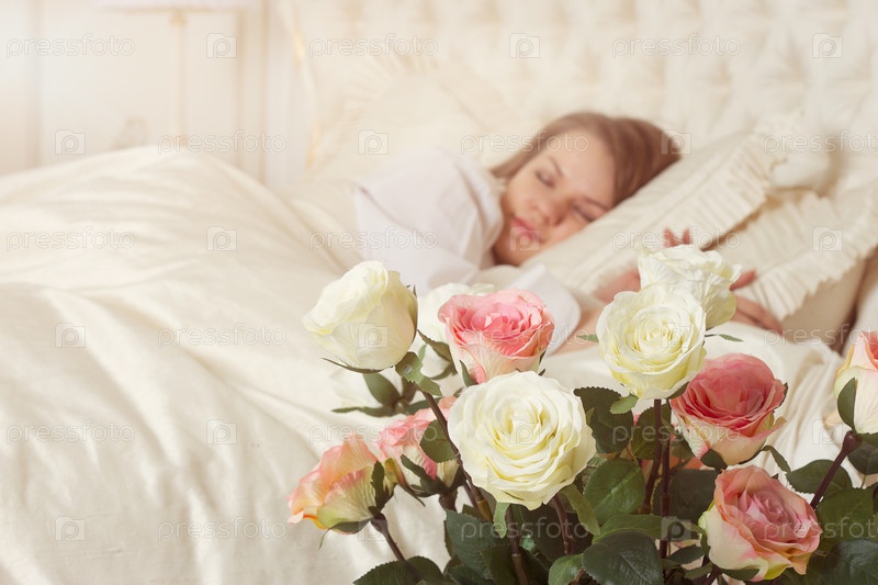 Спящая женщина в постели с розами