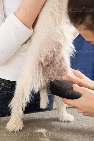 Парикмахер стрижет собаку породы Джек-Рассел терьер