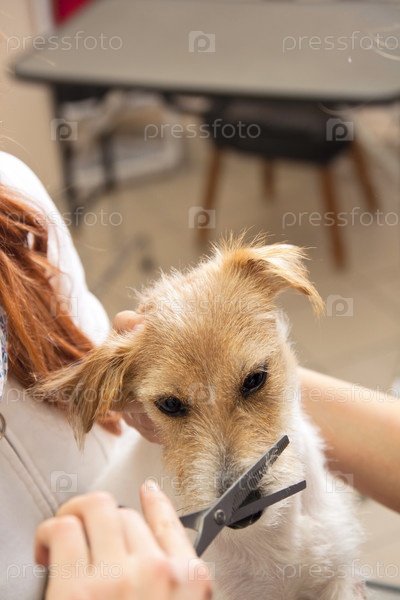 Парикмахер стрижет собаку породы джек-рассел терьер