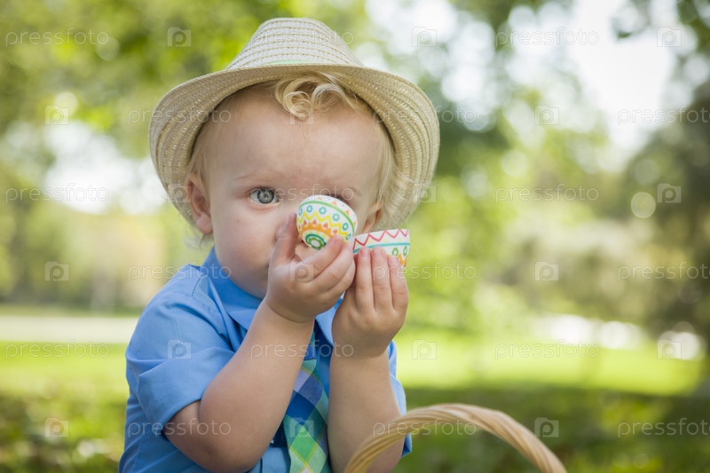 Мальчик с пасхальными яйцами в парке