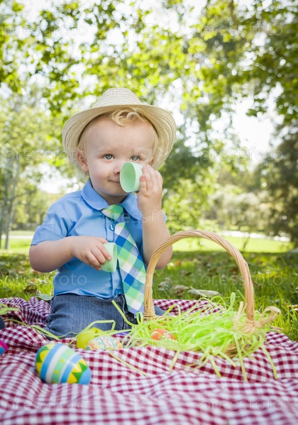 Мальчик с пасхальными яйцами в парке