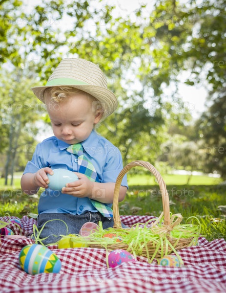 Мальчик с пасхальными яйцами в парке