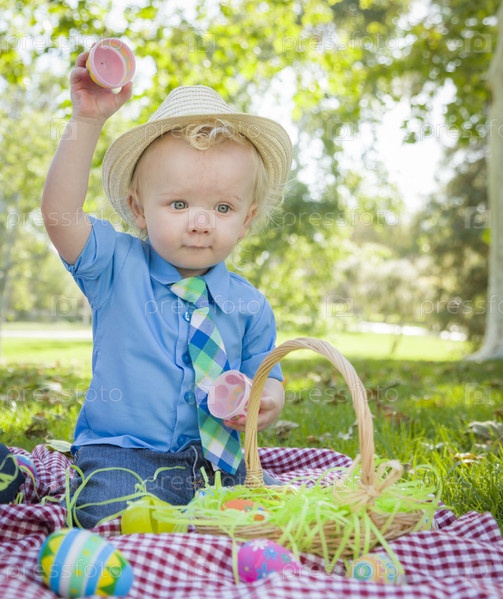 Мальчик с пасхальными яйцами в парке