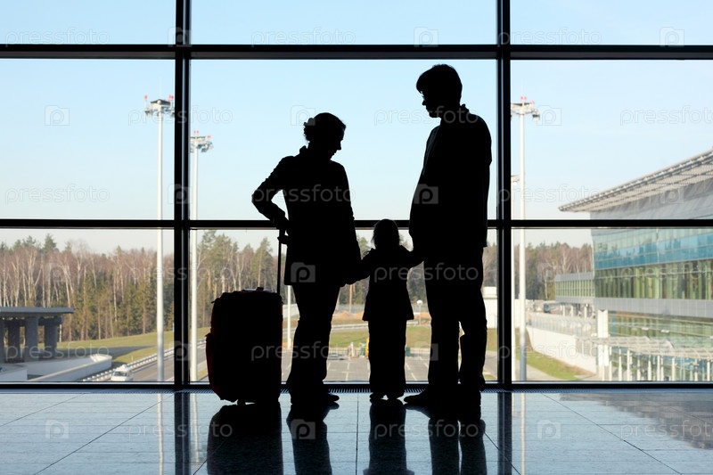 Силуэт семьи с багажом возле окна в аэропорту
