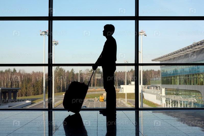 Силуэт мужчины с багажом возле окна в аэропорту