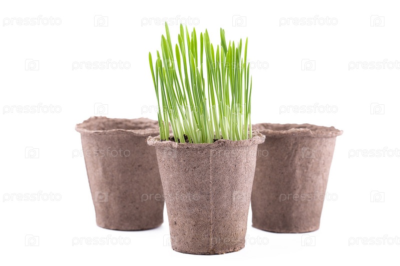 Торфяные горшочки с травой, изолированные на белом фоне