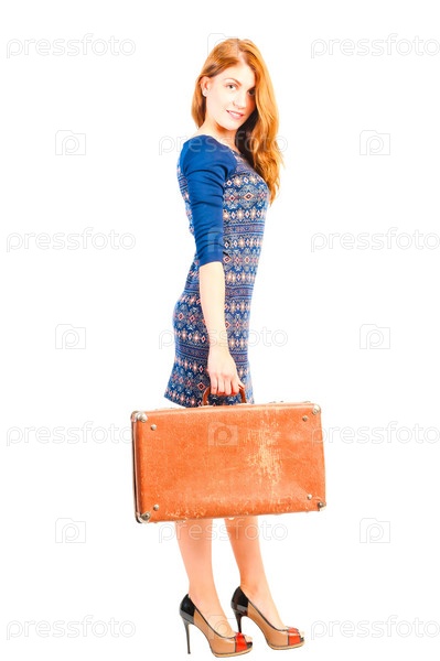 Девушка в платье со старым чемоданом