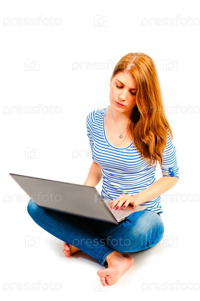 Красивая женщина, сидящая с ноутбуком