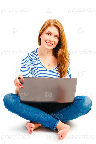 Красивая женщина, сидящая с ноутбуком