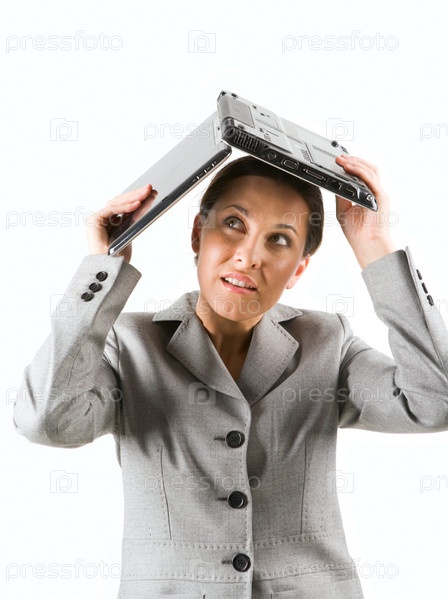 Портрет деловой женщины, защищающей голову ноутбуком на белом фоне