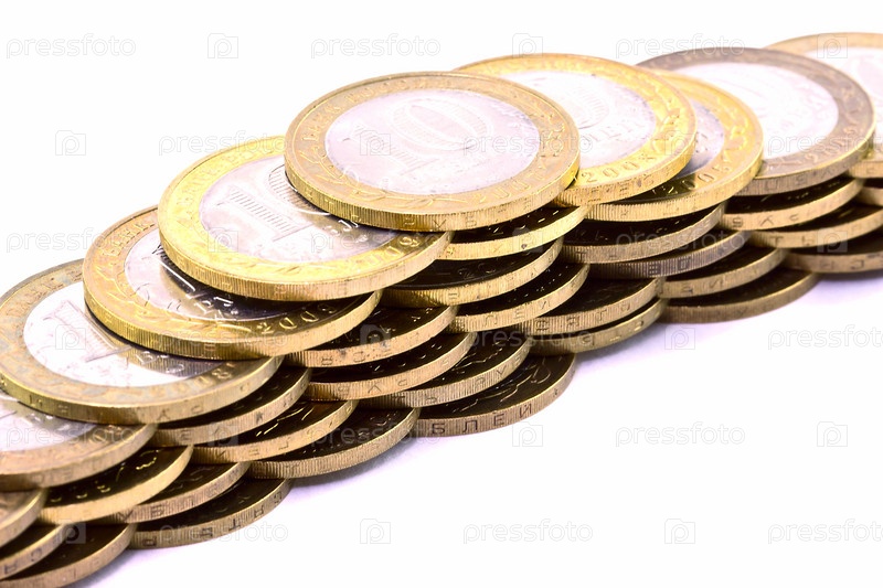 Линия монет достоинством 10 рублей на белом фоне