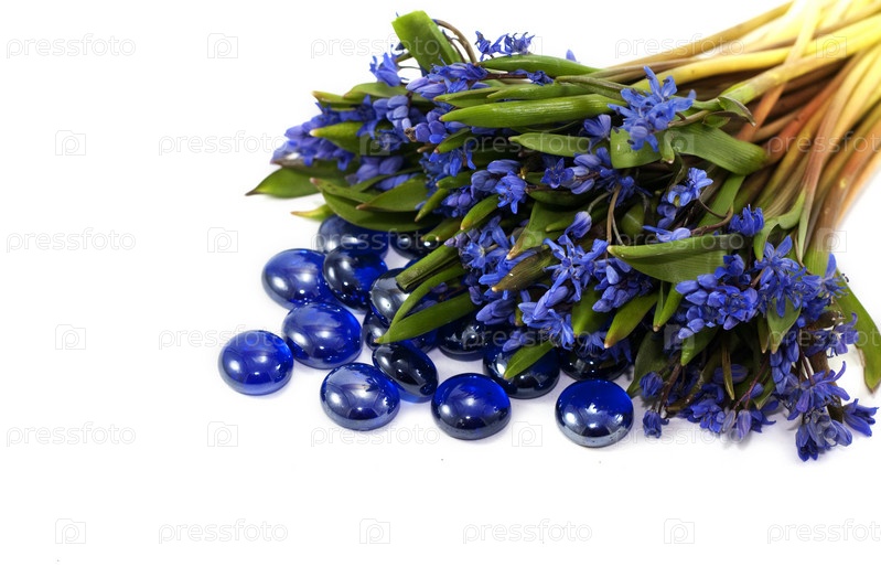 Букет фиалок с синими камнями лежит на белом фоне