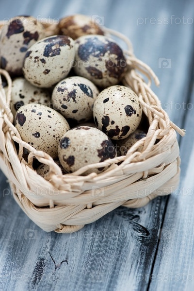 Сырые перепелиные яйца в плетеной корзине