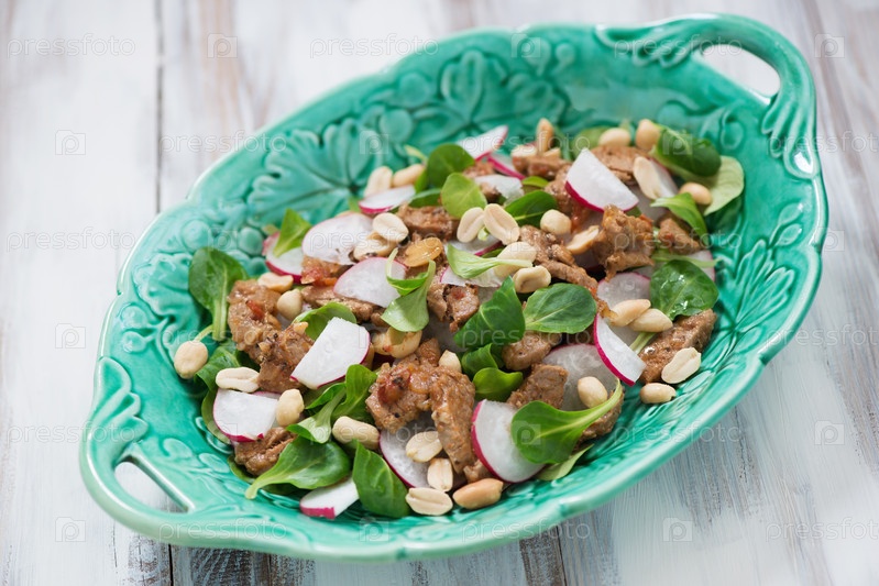 Салат с редисом, жареным мясом, листьями салата и арахисом