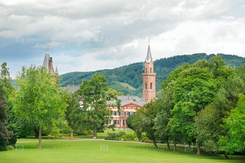 Городской парк с лужайками и замком