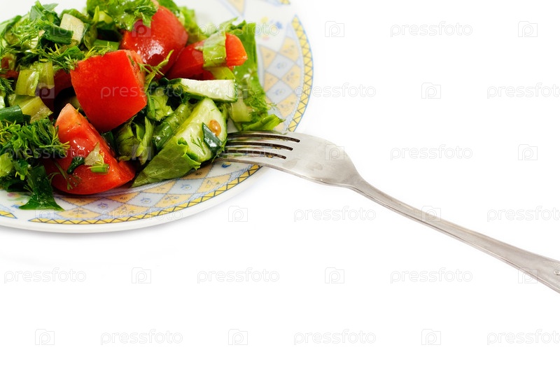 Свежий овощной салат на тарелке с вилкой на белом фоне