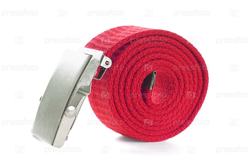 Красный женский ремень с металлической пряжкой на белом фоне
