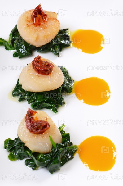 Морские гребешки со шпинатом и помидорами
