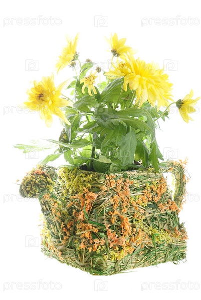 Плетеный цветочный горшок в форме лейки с желтыми хризантемами на белом фоне