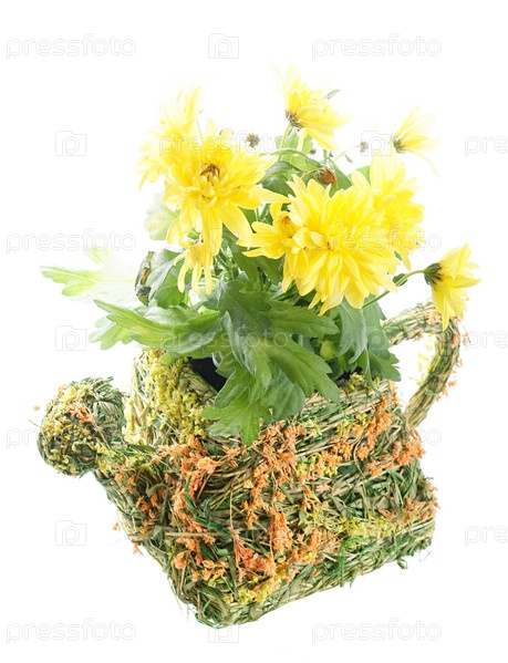 Плетеный цветочный горшок в форме лейки с желтыми хризантемами на белом фоне