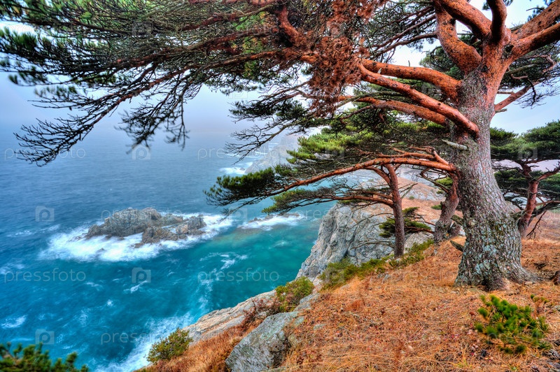 Кедры, растущие на скалистом берегу моря