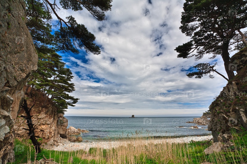Кедры, растущие на скалистом берегу моря