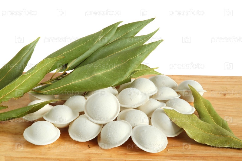 Некоторые сырые равиолои, готовые к кипению с лавровым листьем на деревянном фоне.Традиционная русская еда 'пельмени'