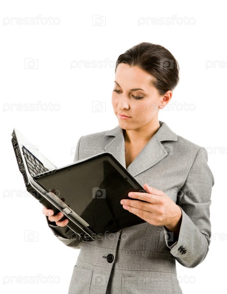 Портрет деловой женщины, держащей ноутбук и читающей информацию с его дисплея