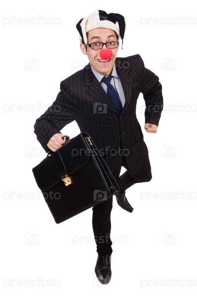 Бизнесмен с клоунским носом, изолированный на белом фоне