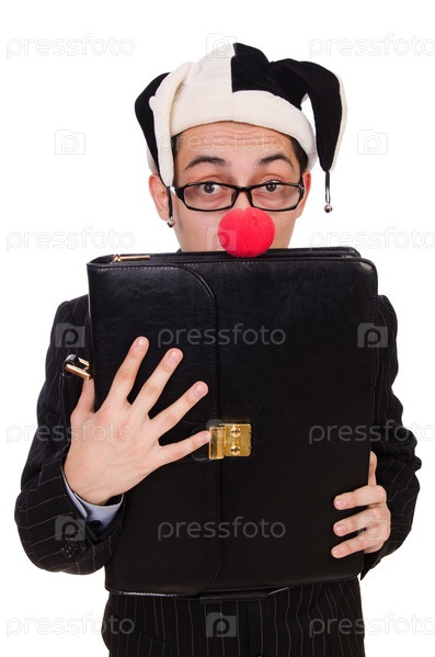 Бизнесмен с клоунским носом, изолированный на белом фоне