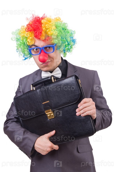Бизнесмен в костюме клоуна, изолированный на белом фоне