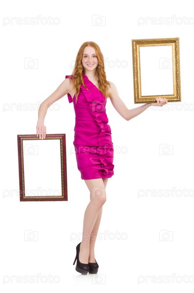 Женщина с фоторамкой на белом фоне