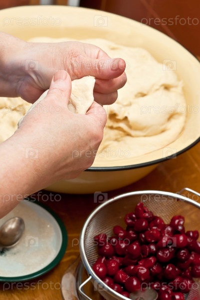 Женские руки, стряпающие вареники с вишней