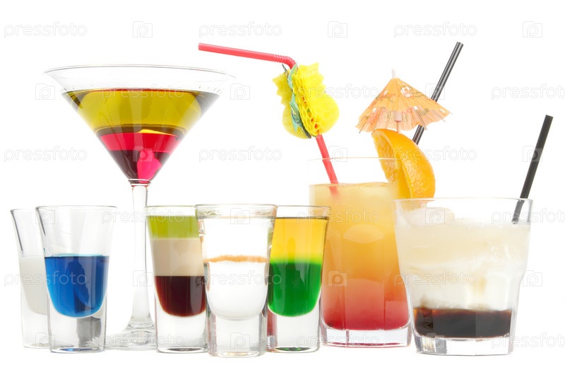 Разные алкогольные коктейли на белом фоне