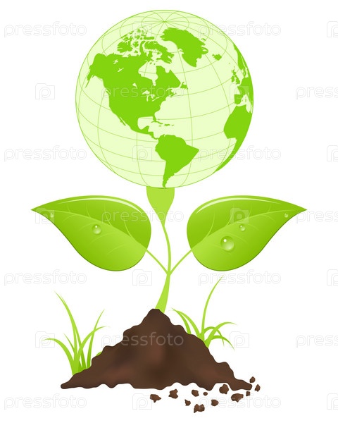 Символичное изображение зеленого глобуса в виде цветка, растущего из кучки земли