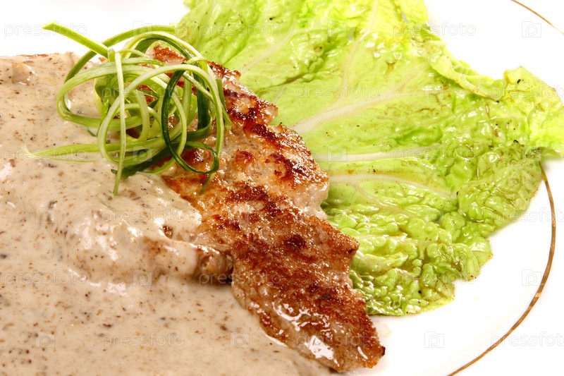Бифштекс с соусом и салатом на белой тарелке