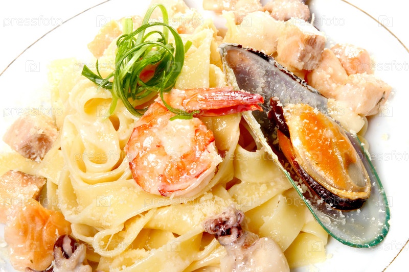 Макароны с сыром пармезаном, соусом и морепродуктами