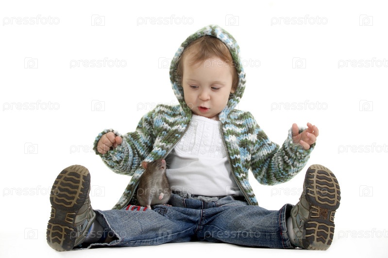 Девочка играет с большой серой крысой