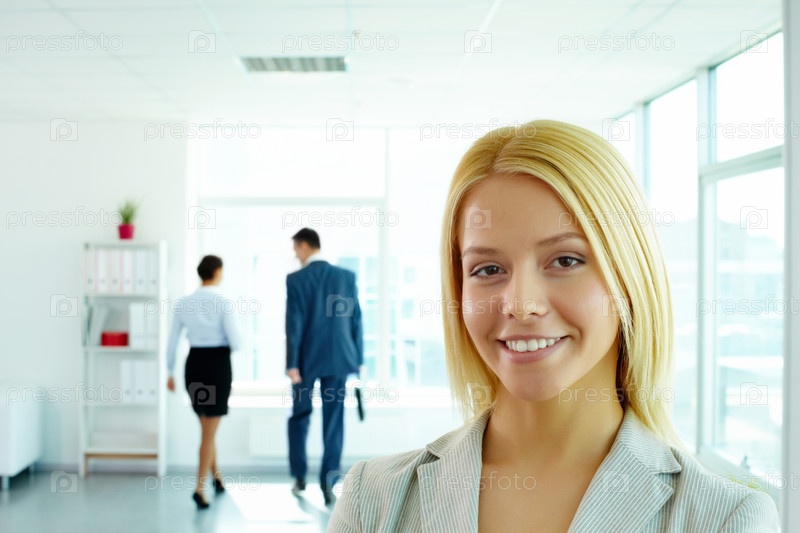 Портрет улыбающейся бизнес-леди в офисе на фоне своих коллег