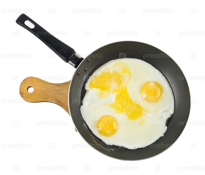 Яичница на сковороде, изолирована на белом фоне
