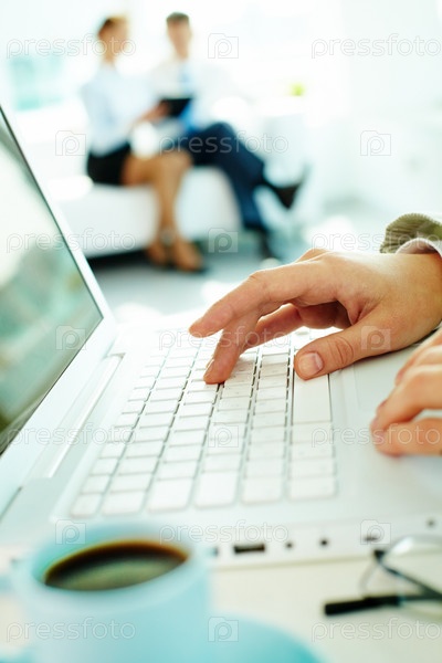 Руки бизнес-леди, работающей в офисе на белом ноутбуке на фоне своих коллег