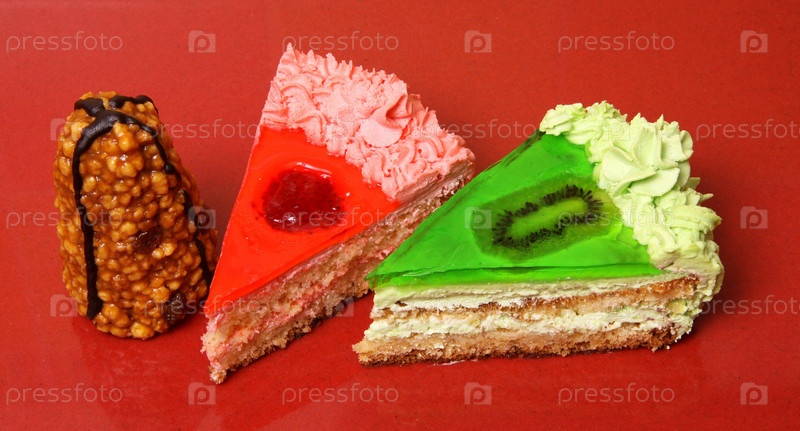 Два куска торта и пирожное на красном фоне