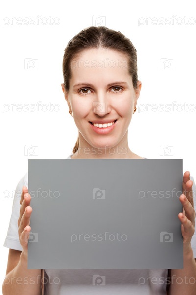 Портрет молодой женщины с серым листом в руках на белом фоне