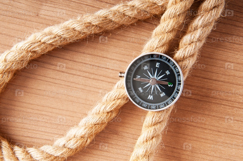 Компас и веревка, лежащие на деревянном столе