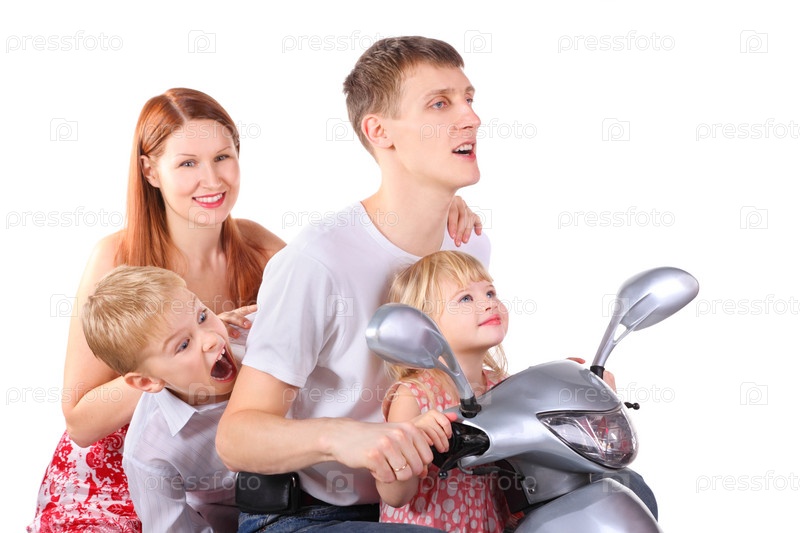 Портрет счастливой молодой семьи, сидящей на мопеде на белом фоне