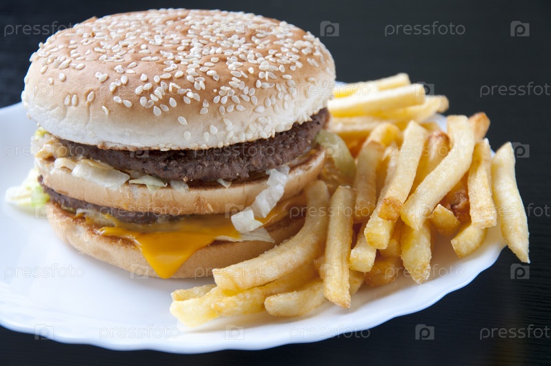 Двойной гамбургер и картофель фри на белой тарелке